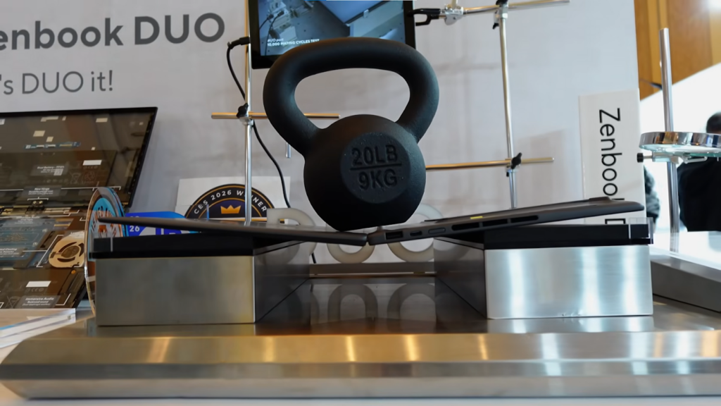 Trong buổi trình diễn tại CES, ASUS đặt trực tiếp một quả tạ 20 lbs (khoảng 9 kg) lên khu vực bản lề khi máy mở phẳng – điểm chịu lực nhạy cảm nhất trên laptop màn hình kép. Kết quả cho thấy khung máy không biến dạng hay nứt gãy. Điều này cho thấy thiết kế mới đã giải quyết đáng kể những lo ngại về độ bền của Zenbook Duo 2026.